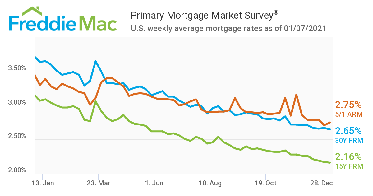 The average U.S. mortgage rate for a 30-year fixed loan fell two basis points this week to 2.65% according to Freddie Mac. That’s the lowest level in nearly 50 years. The 15-year fixed-rate dropped to 2.16% from a 2.17%.